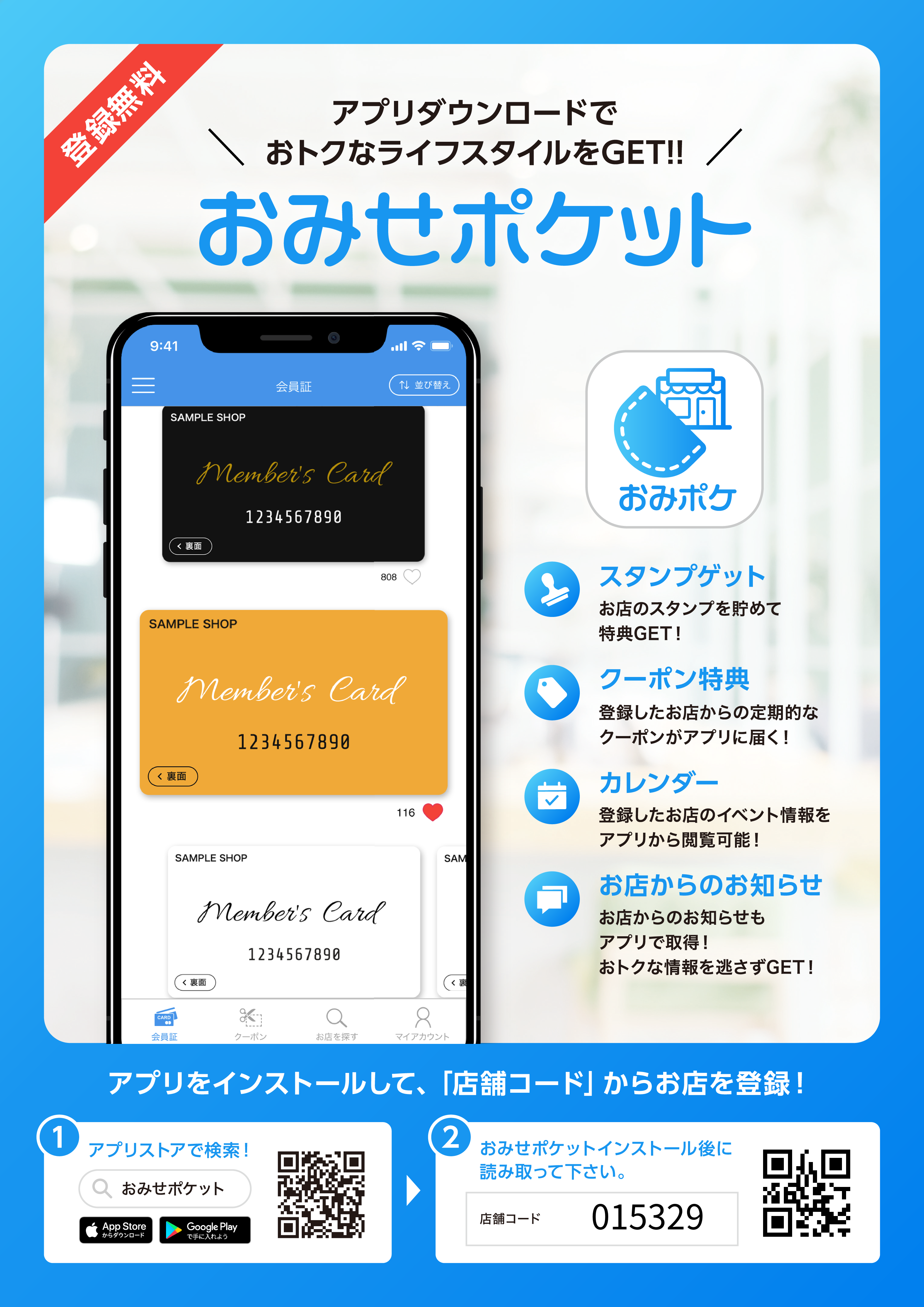 インストール完了後 店舗コード 015329 を入力しお店をご登録下さい。