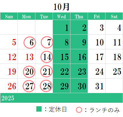 10月の定休日につきましては、下記カレンダーにてご確認くださいませ。